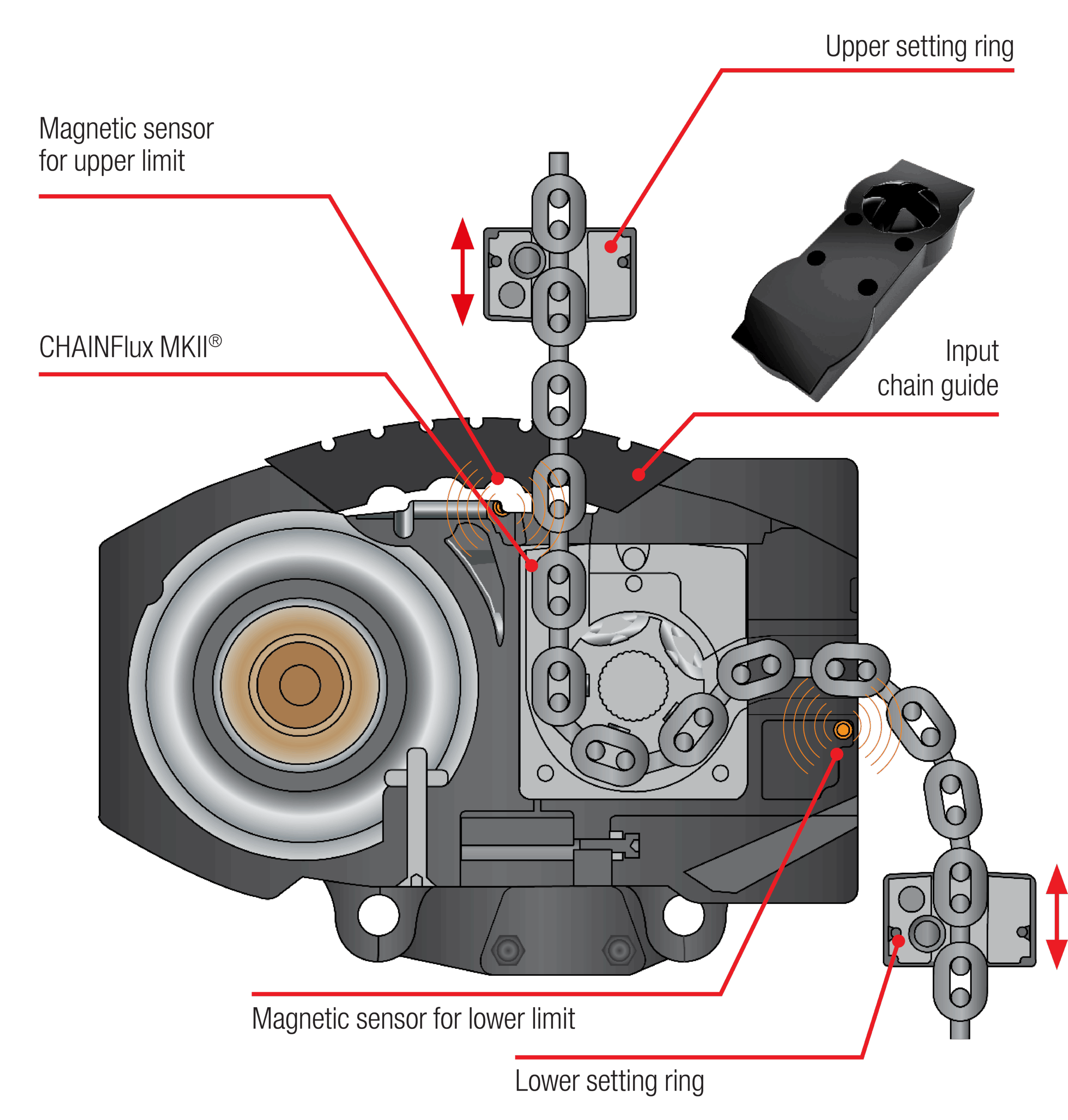 The Limitflux is a built-in limit switch device in the CHAINFlux MKIII that’s allow to control setting of hoist or hook position in industrial suspension or climbing configuration. Accuracy of the system is given at one link of lifting chain. The setting of the limit is operated by two magnetic ring (upper and lower) which can be easily moved and set along the lifting chain.